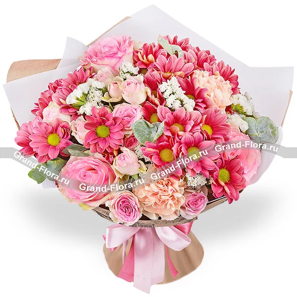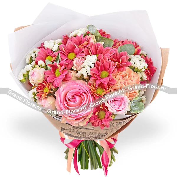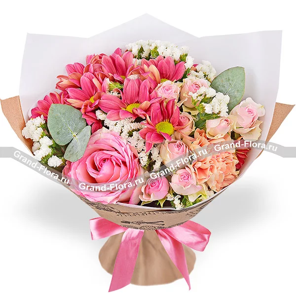 Стандартный: роза розовая - 2 шт., кустовая хризантема темно-розовая - 3 шт.,кустовая роза розовая - 2 шт., гвоздика персиковая - 2 шт., статица, эвкалипт, упаковка, лента. Примерный размер: 30Х30 см.